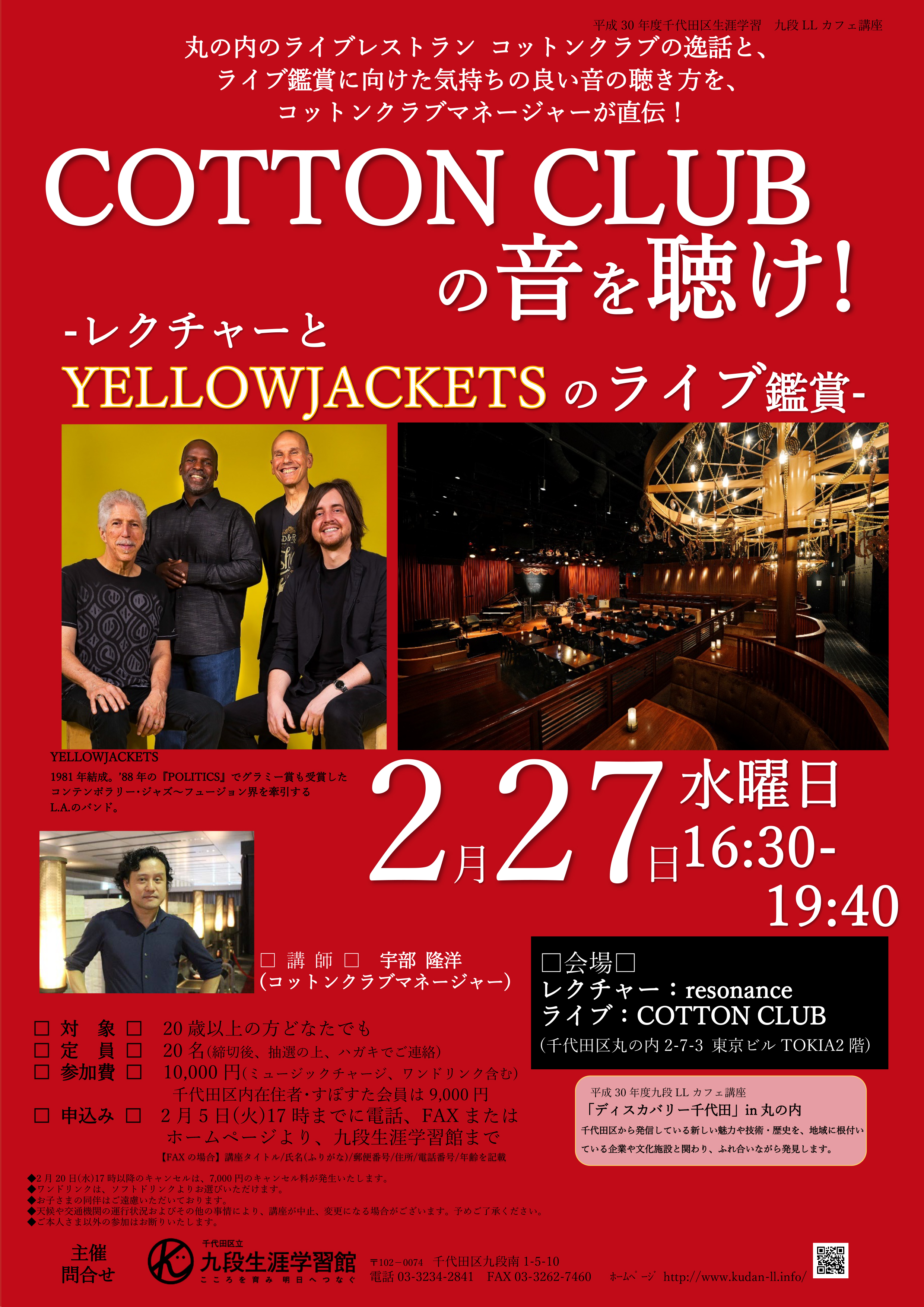 平成30年度 千代田区生涯学習 九段LLカフェ講座「COTTON CLUBの音を聴け!-レクチャーとYELLOWJACKETSのライブ鑑賞-」