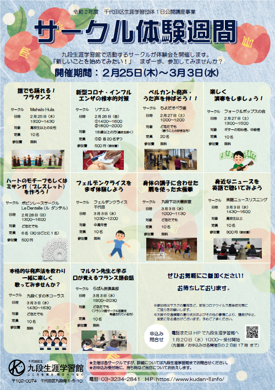 ・主催は各サークルですが、詳細については九段生涯学習館までお問合せください。