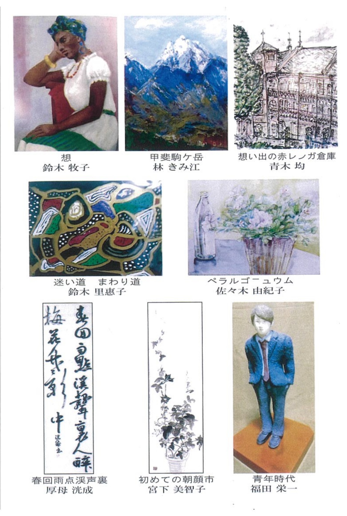 出品数は、およそ60点、油彩、ろう画、水彩、版画、書道、巻物、墨絵、水墨画、写真、押し花絵、葉彩画、折り紙の平面作品と、桐塑、陶芸等の立体作品です。力作が揃っています。御覧ください。