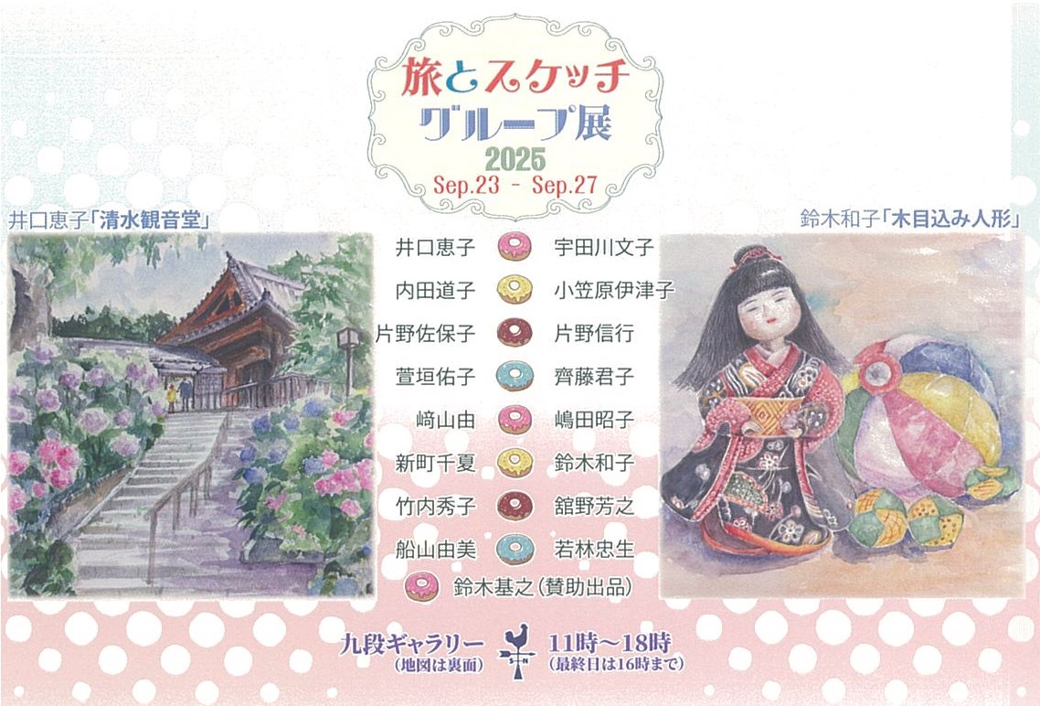 今年もグループ展の開催をさせていただきます。当会は月に1回、各所に出かけてスケッチをしつつ、不定期にモデルデッサンやストーンアート(石ネコ)を楽しんでいます。メンバーそれぞれの個性溢れる作品を是非お楽しみください。また今年も鈴木基之氏の水彩画大作も特別展示いたします。皆さま方のお越しを心よりお待ち申し上げております。