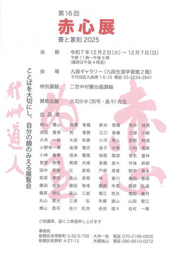 ことばを大切にし、自分の顔のみえる書と篆刻の展覧会です。大石分水(嵓々)先生の教場で学ぶ、約50名による作品80点ほど。