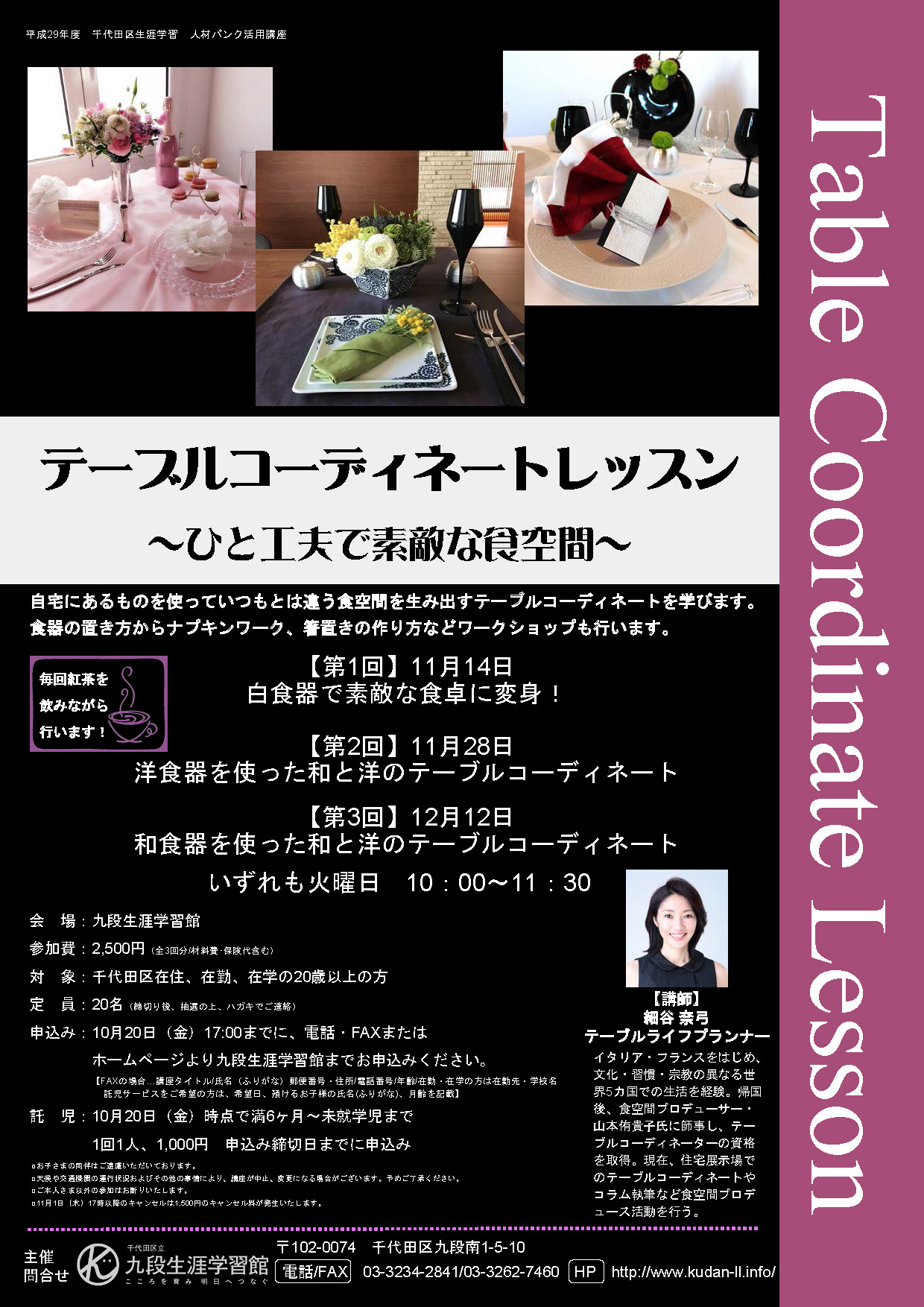 平成29年度 千代田区生涯学習人材バンク活用講座 「テーブルコーディネートレッスン~ひと工夫で素敵な食空間~」