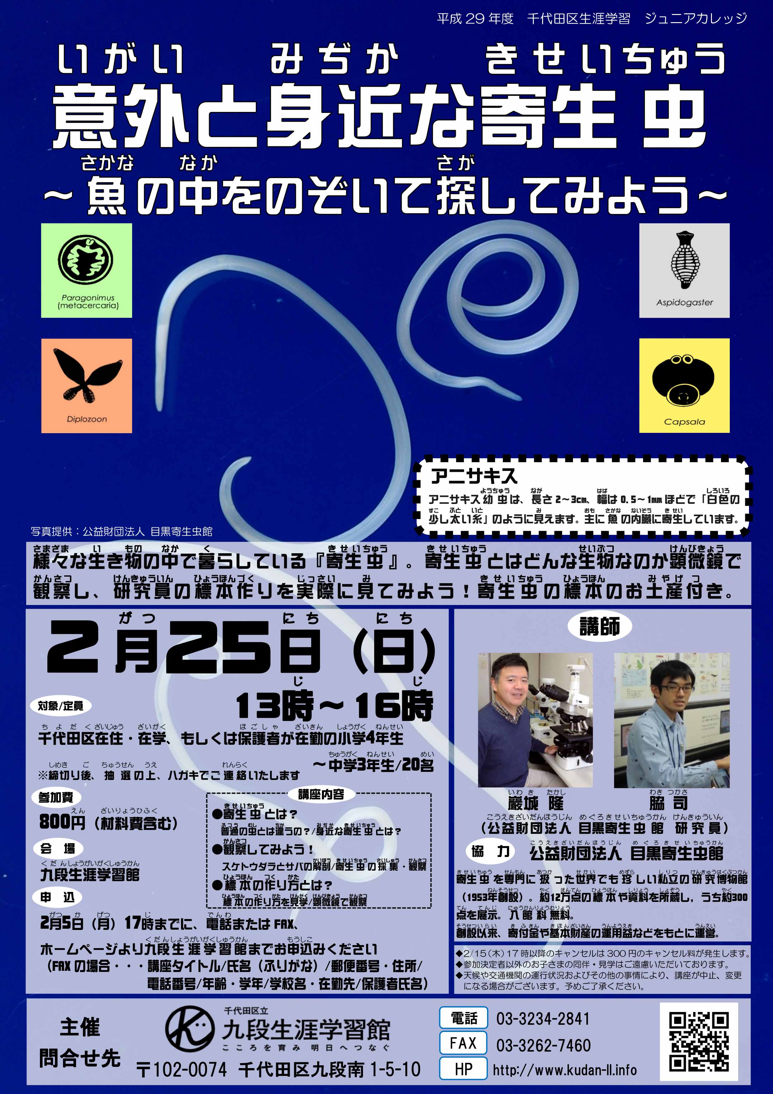 平成29年度 千代田区生涯学習 ジュニアカレッジ「意外と身近な寄生虫~魚の中をのぞいて探してみよう~」