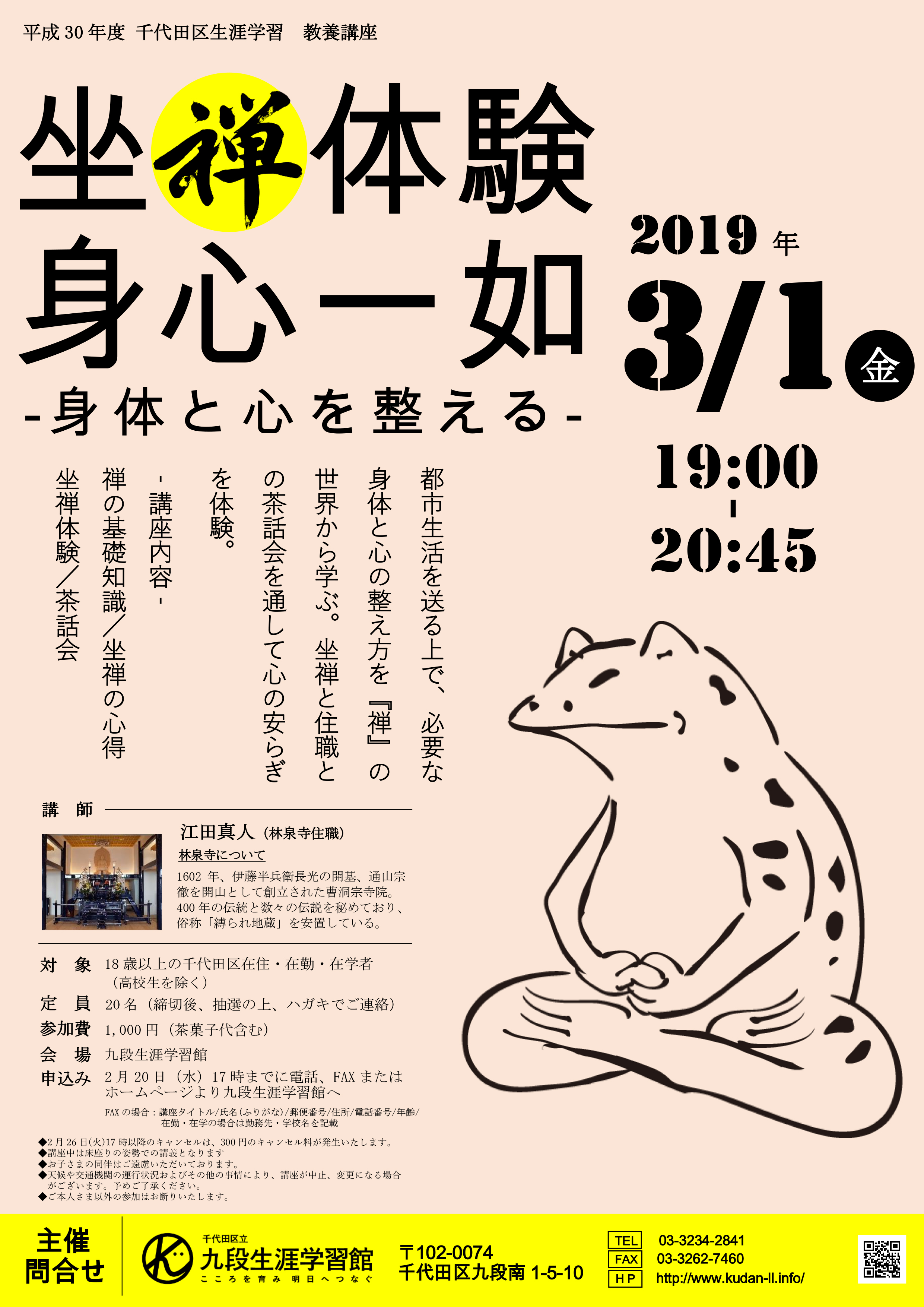 平成30年度 千代田区生涯学習 教養講座「坐禅体験 身心一如 ~身体と心を整える~」