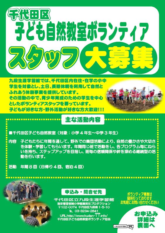 九段生涯学習館では、千代田区在住、在学の子どもを対象に土日、長期休暇を利用して、学校外での自然体験、生涯学習プログラムを提供しています。