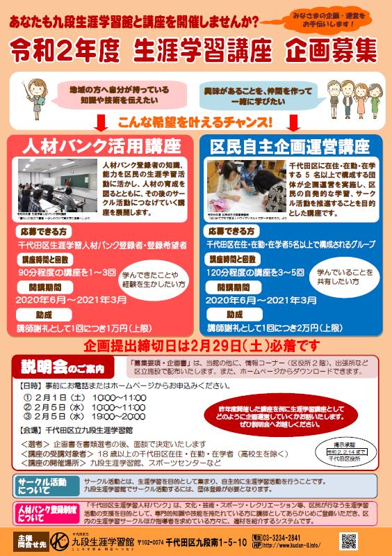 令和2年度に九段生涯学習館で開催する生涯学習講座の企画を募集いたします。