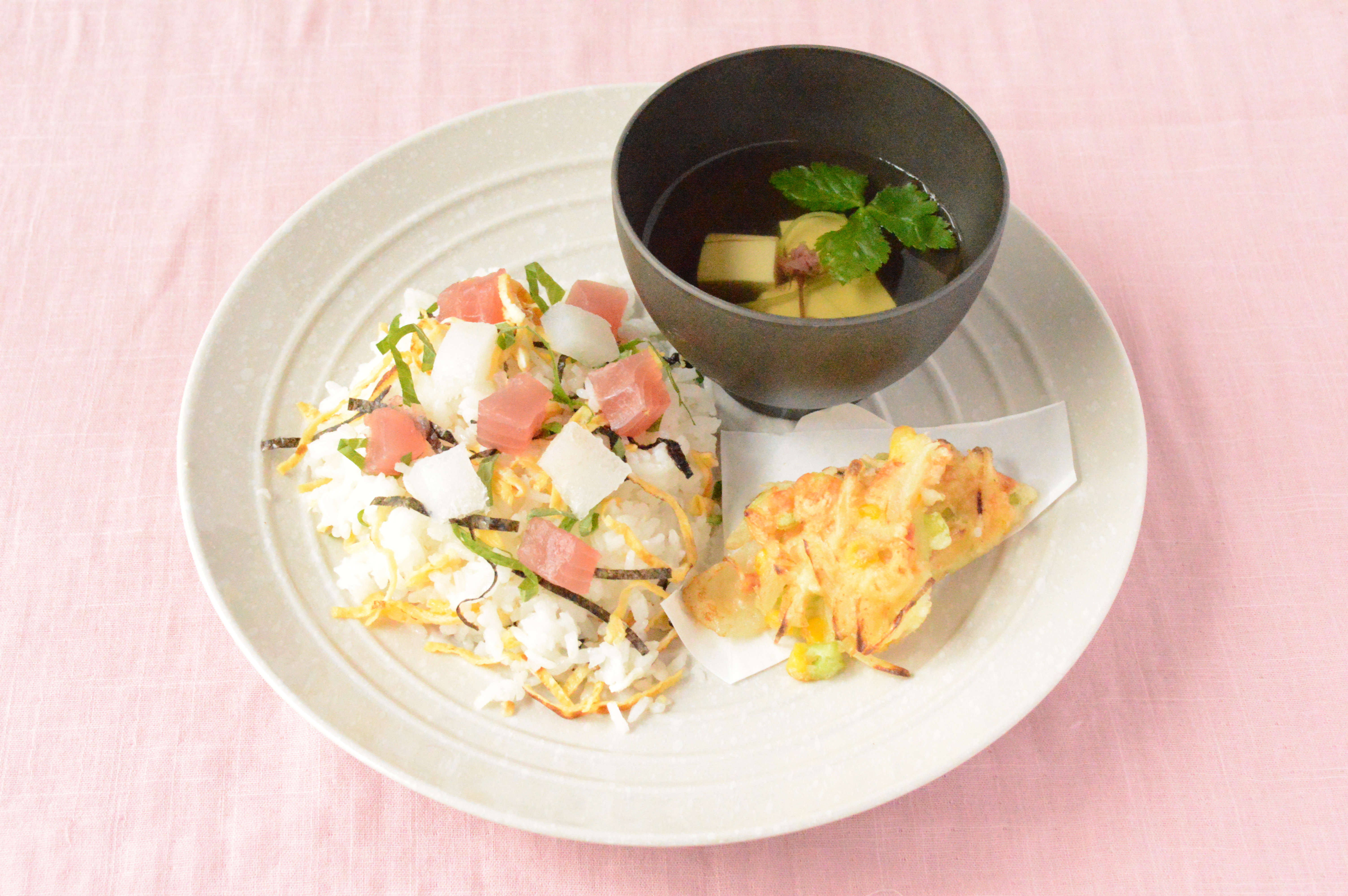 春のおもてなしちらし寿司・桜エビとコーンのかき揚げ風・桜の塩漬け入りすまし汁