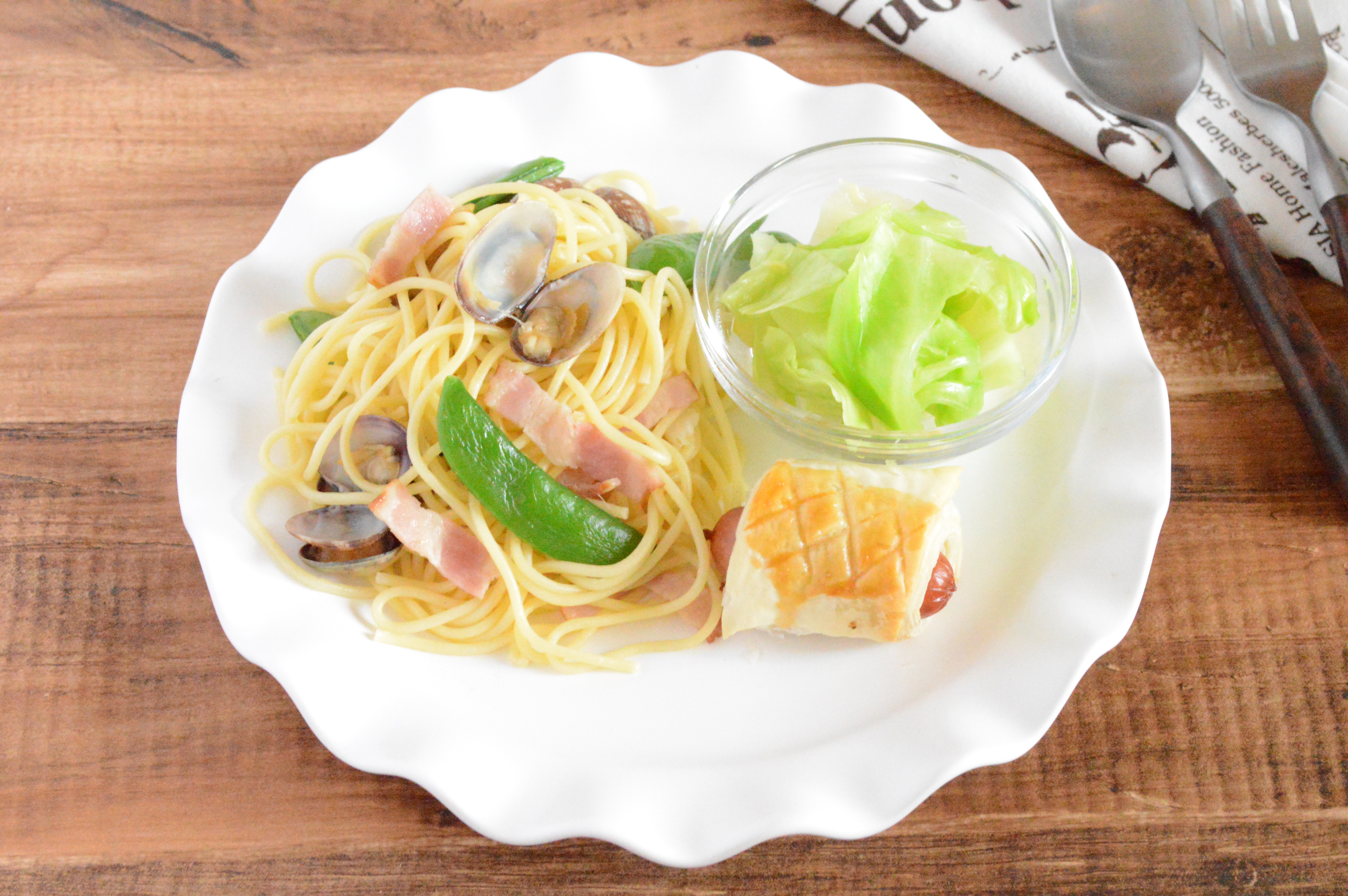 あさりとスナップエンドウのパスタ・春キャベツのはちみつレモン和え・ミニウインナーパイ
