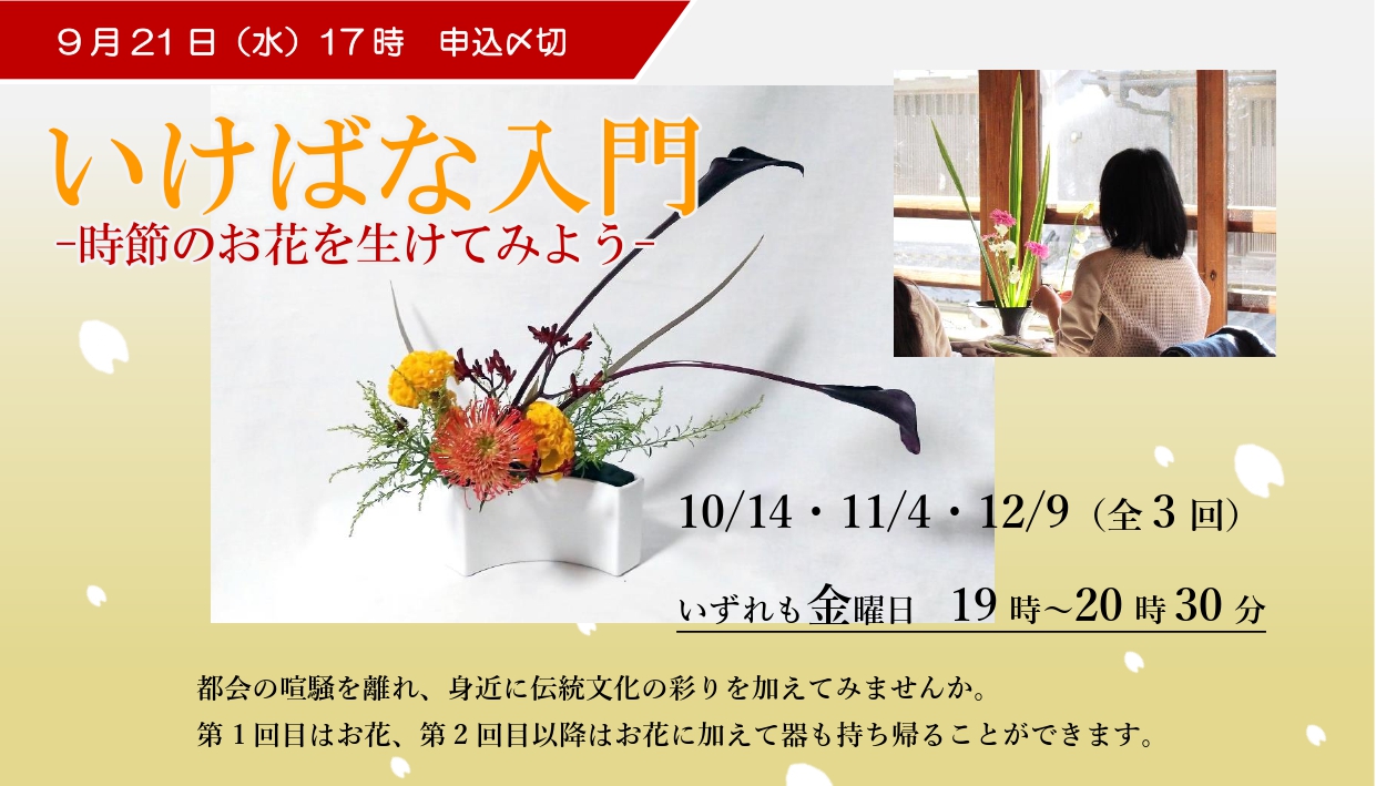 都会の喧騒を離れ、身近に伝統文化の彩りを加えてみませんか。第1回目はお花、第2回目以降はお花に加えて器も持ち帰ることができます。