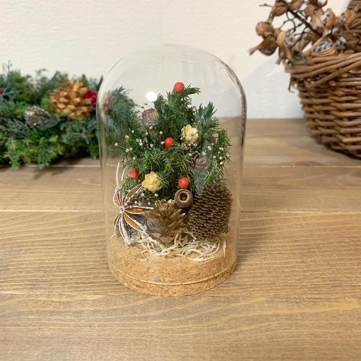 ドライフラワー等で飾り付けし、ミニツリーの入った冬のガラスドームを作ります。(高さ12㎝ほど)