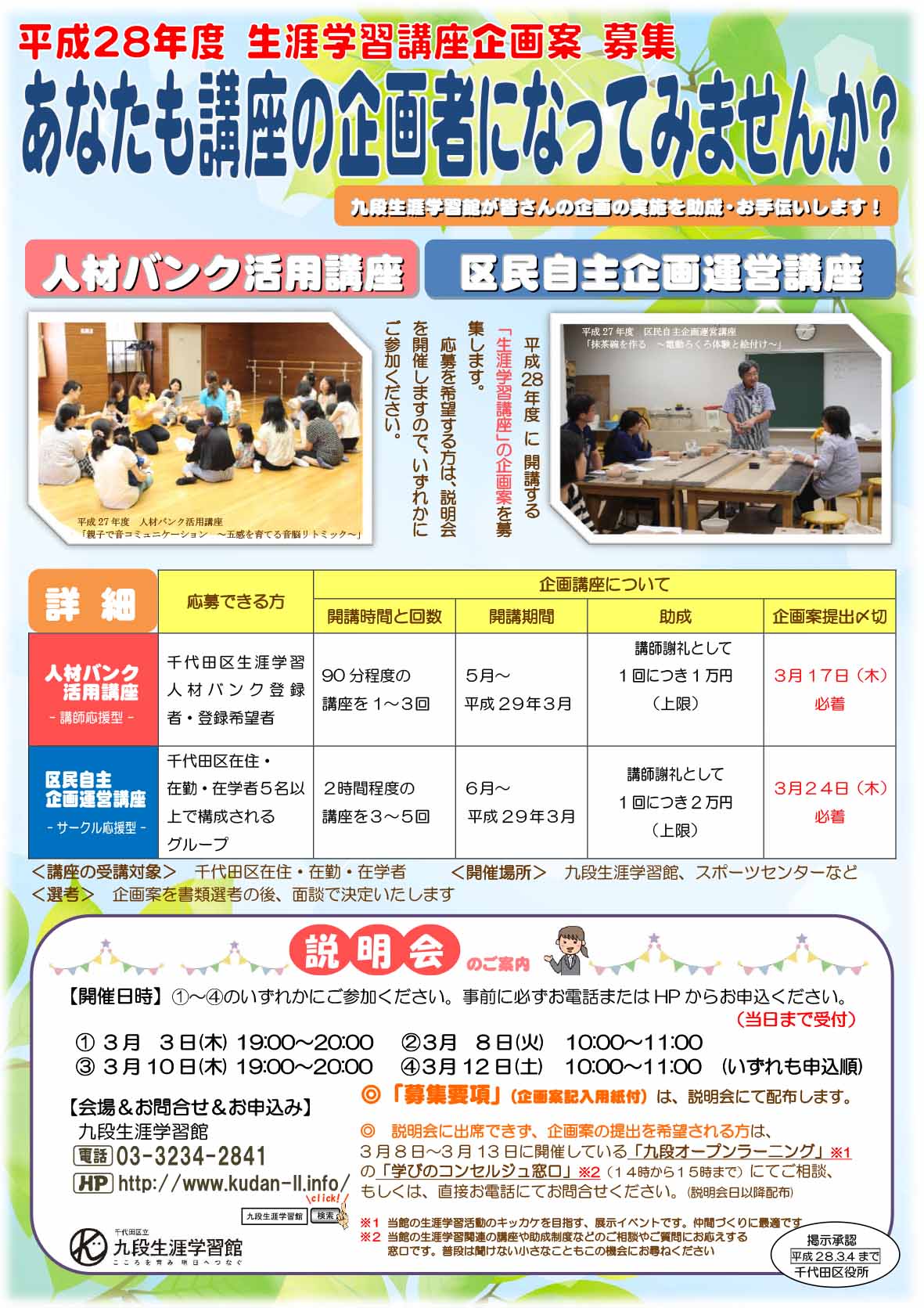 平成28年度に九段生涯学習館で開催する生涯学習講座の企画案を募集いたします。